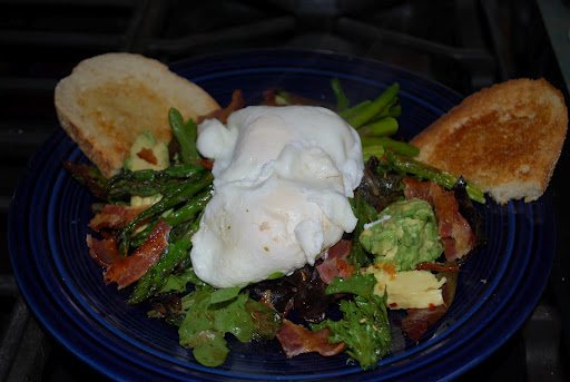 When is comes to hosting brunch, Eggs Benedict is my go to dish. We were expecting a friend for brunch this morning, and I felt like making something a bit lighter and “springier” than my standard brunch specialty. Lying in bed this morning, I considered the contents of my fridge and was inspired by the salad greens, asparagus, roasted red pepper and avocado available, and decided to make a brunch salad. I had a pound of Falvo’s thick-cut bacon on hand and I got that going under the broiler along with a bunch of asparagus that I had drizzled with olive oil, sea salt and cracked pepper. While the bacon and asparagus broiled, I tossed my mixed baby greens with olive oil and balsamic vinegar and threw in some herbs de Provence, sea salt and pepper. After the broiling was done, I shifted my attention to poaching the eggs and toasting some sourdough bread. I arranged the greens, chunks of avocado, crumbled bacon, and grilled asparagus on individual plates and then finished the salads with a couple of poached eggs and grated parmesan. I must say, it was delicious! Maybe the olive oil and bacon were no “lighter” than butter and ham, but I certainly felt as if it were a more virtuous brunch entree. And my theory that everything tastes better with an egg on top has been affirmed. What is your favorite brunch item?