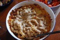 Melt 3 or 4 T of butter in a double boiler. I nestle a stainless bowl inside a saucepan filled with a few inches of very hot, but not quite boiling, water. Gradually whisk in an equal amount of flour. Whisk constantly for a few minutes until the flour is fully incorporated and loses its “raw” taste. Begin adding milk in small increments allowing each addition to thicken prior to adding more. I probably used about 3 cups of 2% milk. When the sauce is of a consistency that you enjoy (err on the side of too thin rather than too thick since things will change when you add the cheese) add grated cheese (maybe ~3 cups) and stir to a smooth consistency. Last night I used baby Swiss, aged gouda and some sharp cheddar – this is a bit of an exercise in cleaning out the cheese drawer for me. Season to taste with salt and pepper. I also like to add some smoked paprika for an added flavor dimension as well as for color. Combine cheese sauce with al dente pasta (last night I used whole wheat spirals) and place in a lightly buttered baking dish. Top with dried bread crumbs and bake at 375 for about 20 minutes. Yum – the perfect antidote to a rainy Monday.