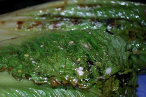 Say that title 3 times fast. Anyway – I’ve been running my mouth for the last couple of days about how Sunday was going to be “Greek” night at our house. Give me a little ground lamb and some feta and somehow that equals Greek in my mind. Dinner ended up having even more variety than I had initially planned, and it sure was delicious. I started the grill with a couple of big red peppers roasting. As they charred, I sliced up an eggplant and combined some tahini paste with sesame oil and kecap manis to make a nice basting sauce. The eggplant slices went on the grill dry and as I turned them, I brushed on some of the Asian-style sauce. As the eggplant finished up, the next thing to be tossed on the grill were the asparagus. We pretty much live on these during the spring, stinky-pee be damned, and these were really prime, tossed with a little olive oil and coarse salt. Next up was the grilled ceasar salad – completely inspired by Rick Weber’s salad at McGuire’s. I wasn’t certain exactly how Rick prepared the romaine and I thought it might be interesting to brush (did I mention how much I love my various silicone brushes from Utilities in P’town?) the romaine heads with the actual ceasar dressing. My ceasar dressing is aggressive with lots of garlic, olive oil, lemon juice, anchovy paste and salt and pepper. I turned the grill down to medium-low and brushed and turned the lettuce for about 5 or 6 minutes until it had a nice little smoky look but was still cool in the center.