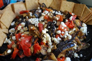 At this point, we decided to join our wonderful new neighbors, and so, with a burst of genius, I transformed the grilled eggplant, and roasted red pepper into a lovely coarse dip by chopping them together and then tossing with feta cheese. With some old-school Triscuits on the side, it made a terrific, simple appetizer in no time flat.
