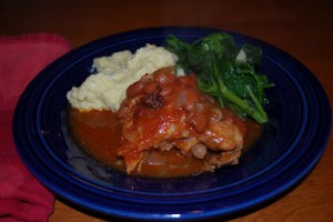 I began by softening a couple of cloves of garlic and a medium onion in a few tablespoons of olive oil. As this was happening, I opened a can of crushed tomatoes and poured them into the crockpot. After removing the vegetables from the olive oil (and adding them to the crushed tomatoes), I seared the chicken briefly on each side. While the chicken browned, I added to the tomatoes a rinsed and drained can of red kidney beans, and 3 chopped chiles, along with a couple of teaspoons of the adobo liquid. The chicken thighs were added to the sauce, the lid was placed on the crockpot and dinner was was only 3 effortless hours away.