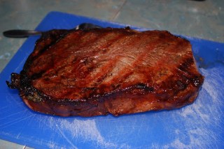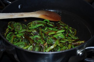 It seems like a looong time since I’ve cooked a family meal, but Sunday was an excellent time to jump back into things. How about those storms? It really was a wonderful day to hang around the house watching the London broil marinate, making a few quarts of chicken stock and folding bushels of laundry. Last week Price Chopper had the London broils buy 1 get 2 free, so we took advantage of that deal and tossed a couple in the freezer while reserving one for family night. I marinated the beef in kecap menis (Seriously – have you gotten any of this yet?? What are you waiting for??), ginger, balsamic vinegar and fresh thai basil for most of the day before tossing it on a hot grill for approximately 15 minutes. I must say, the steak was beautifully cooked – medium rare with a bit of a “crust” on the outside due to the carmellization of the palm sugar in the marinade. Delicious! I paired the beef with some fiddleheads I found in the crisper. I honestly think they’ve been in that drawer for about 10 days, but they survived their exile pretty well, and they sure were tasty after some time spent in the pan with bacon fat and minced garlic. Ok – so what wouldn’t be tasty with bacon fat and garlic?
