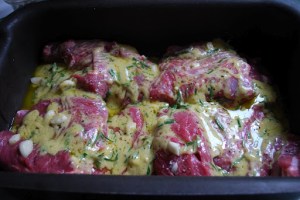 We originally planned to grill steaks, burgers and hot dogs but I got a hankering for something a bit more interesting.  Leg of lamb was the answer!  We called Falvo’s and asked them to prepare a butterflied piece for 12 adults.  $47 later (which really seems like a fair price for the beautiful, hand cut piece of lamb) we were in business.  Fairly recently I was at some appointment (nails, dentist) and the television was tuned to Rachael Ray as she prepared a leg of lamb and I let that be my inspiration.  Now, you Racheal Ray haters, she never claimed to be a chef, nor do I, and I do appreciate the simplicity that she brings to the table.  I poked some slits into the lamb and inserted slices of fresh garlic into them.  Next came a generous sprinkling of coarse salt and ground pepper.  And to finish – a bath of olive oil, mustard, lemon juice and chopped rosemary.  We’ll grill that bad boy up later.