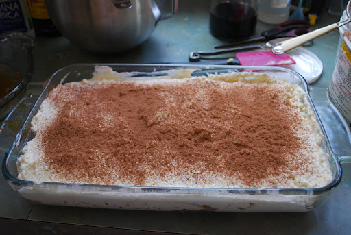We’re wrapping things up tonight with tiramisu and limoncello.  My tiramisu isn’t traditional – I don’t add eggs for starters, but everyone who has sampled it seems to enjoy it.  I soften marscapone and then beat it until smooth.  Next heavy cream, vanilla and sugar get combined to make a whipped cream which I fold together with the marscapone.  I add a generous amount of kahlua and a splash (or two) of sambuca to strong (cooled) brewed coffee in a flat bottomed pie pan.  And then the assembly process begins.  You’ve got to move fast at this point because the lady’s fingers disintegrate in no time flat after they’ve been dunked in the coffee.  I used a large, glass pan this time around because I’m making enough to serve a gang of 12 or 15.  Place the pan of coffee right next to the dish you’re assembling the tiramsu in.  You’ll immediately understand why when you dunk your first row of lady’s fingers.  It’s a pretty simple process of dunk, place and top with a generous layer of the whipped marscapone cream.  Repeat.  I usually do two layers and finish by dusting the top with cocoa powder.  Refrigerate.