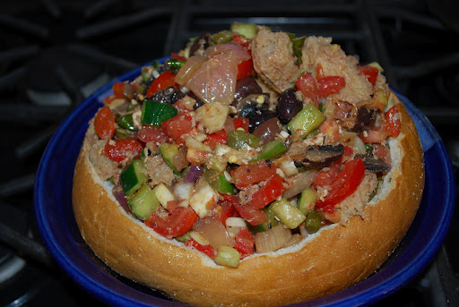 We wanted to keep things pretty simple and not have to fuss when we could be swimming or lazing around, so I tried to make items that would be prepped in advance.  Continuing to riff on the Tuscany theme seemed to make sense so I decided on a panzanella salad and tiramisu to start and end the meal.  I’ve made panzanella before – it is truly the perfect way to throw together summer’s bounty in one bowl, but I really played with it this time around.  Operating on the premise that most anything tastes better when grilled, I grilled all the veggies for the salad – other than the tomatoes, cuke and the fennel.  It’s nice to have a bit of crunch, too.  For vegetables I chose red peppers, zucchini, portobella mushrooms and red onion.  The zucchini were cut into thick discs which I brushed with olive oil.  I left the mushrooms whole during grilling and gave them a little brush of olive oil as well.  After the veggies were all cooled, everything got a coarse chop, a dash of sea salt and a toss to mix in a large bowl.  I julienned the fennel and chopped the cucumber and added them to the mix along with a drained jar of capers, a big handful of chopped basil, some cubes of fresh mozzarella and about 3/4 cup of nicoise olives.  This morning I finished things up by adding 3 chopped tomatoes and a drizzle of olive oil and balsamic to the bowl of veggies.  I hollowed out a round loaf of sourdough and then tore the insides of the loaf into chinks which I places on a baking sheet.  A 1/3 of a cup of olive oil was warmed with 3 minced cloves of  garlic which I then tossed with the bread chinks and warmed in the oven until crunchy.  The bread was introduced to the vegetables and the combined ingredients were then spooned into the bread bowl.  Done.