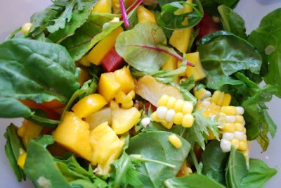 To my foundation of greens, I added: roasted beets (really – you don’t like beets? Really? These were like candy!), fresh corn off the cob (leftover), yellow cherry tomatoes, yellow peppers and cubed mango. I finished the salad with a dressing of olive oil, balsamic, salt, pepper and mustard. Totally delicious. For the last two days I’ve been craving arugula with olive oil, lemon juice and salt so that’s my mission for today. Don’t you love summer eating?