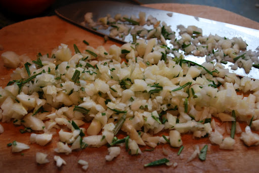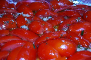 Lucy gave me a lot of tomatoes so I quadrupled the recipe – using 1 1/2 cups of olive oil, 8 garlic cloves minced, about 1/4 cup finely chopped rosemary, and 4 t of both fresh ground pepper and coarse salt. These ingredients were combined in a large bowl to which I added about 24 quartered plum tomatoes. After allowing the flavors to mingle for about 10 minutes I lifted the tomatoes out of the bowl (naturally reserving the luscious flavored olive oil) and placed them, cut side down, on a foil lined baking sheet. I popped the baking sheet into the oven for 45 minutes at 425 degrees (can someone please tell me where the symbol for “degrees” is on my Mac, please?) and let the house fill with the aroma of tomatoes, garlic and rosemary roasting.