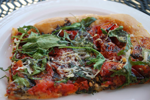 I used them yesterday when I made this tasty, rustic* pizza. I used some of that flavored olive oil to lightly coat a baking sheet and then dusted it with some coarse corn meal. After spreading the room temperature dough in my typical inept fashion, I topped it with a smear of pesto, a layer of roasted tomatoes and some grated pecorino Romano. The oven was hot at 475 degrees and I baked the pizza until the crust was a shade of golden brown that I like. To finish the pizza, I threw a handful of arugula on top to wilt, as the oven cooled down. Summer’s here and the living is easy….
