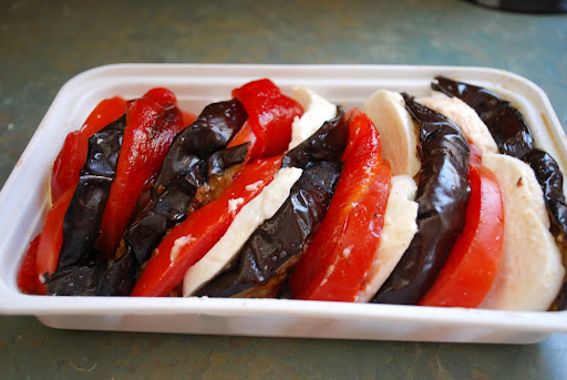 When I roasted those tomatoes last week I didn’t consider tossing the remaining flavored olive oil knowing it would be put to good use in a yet unimagined way.  A couple of tablespoons of it tossed with chunks of mozzarella, grape tomatoes and corn shaved off the cob, made a perfect light dinner the other night.  I still had about 1/3 of a cup of it left so I decided to use it to baste my eggplant.  I sliced the eggplant fairly thick, perhaps 1/2″ to 3/4,”  and placed it dry (no basting yet) on a fairly hot grill – 400 degrees.  I grilled both sides dry for about 4 minutes and then  brushed the tops lightly with the rosemary-garlic olive oil, grilling another 3 minutes on each side.  Maybe I turned them another time, I kind of lost track in my morning pre-coffee fog.  It really isn’t important – cook them until they are a softness that you like, keeping in mind that you may want to assemble them into something that requires additional cooking (pizza topping, warm napoleon with goat cheese and roasted red peppers) and  wouldn’t want them to be mushy.  Unless you like your eggplant that way, of course.