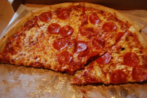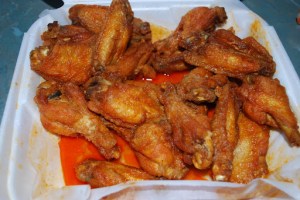 The guys had been jonesing for a pizza/wing feast for awhile so I wasn’t able to grab any photos prior to the onset of the feeding frenzy, but I think you’ll get the gist of things.  We went with a large pie, half pepperoni, a small pizza with onions and 24 wings.  The large pizza was definitely better than the small – we won’t bother going small again.  The crust was decent, fairly crisp and had some of those airy-dough spots that I appreciate.  One of the issues I had with the previous pizza place on this corner was a tendency for them to under-cook the pizza and leave the crust soggy – yuck.  This pizza was definitely cooked the right length of time and the boys were very pleased with the texture, sauce and cheese.  The small pizza was weird – almost as if they assembled it from a different batch of ingredients.  Instead of being crisp it was nearly crunchy and had unfortunately absorbed some flavor from the cardboard.  It just wasn’t good.  The onions were a bit skimpy, especially when