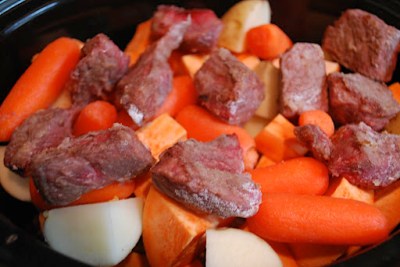 I started by softening some chopped onions in olive oil to lend an additional level of flavor to my end product. I removed the onions with a slotted spoon and they became the first layer in my Crock Pot. I dredged about 1.5 lbs of stew beef (whatever was on sale @Price Chopper last week) in flour and, working in small batches, browned the meat in the onion-y olive oil. When the olive oil began to get a little sparse, I threw in ~ 2T of butter to continue the process. As the meat became brown, I removed it and placed it in the Crock Pot, layering it with chunks of potatoes, about 6 small garlic cloves (whole), peeled chunks of sweet potatoes and carrots. What can I say? I like orange.