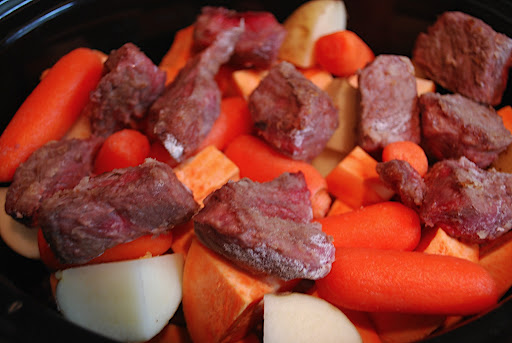 I started by softening some chopped onions in olive oil to lend an additional level of flavor to my end product. I removed the onions with a slotted spoon and they became the first layer in my Crock Pot. I dredged about 1.5 lbs of stew beef (whatever was on sale @Price Chopper last week) in flour and, working in small batches, browned the meat in the onion-y olive oil. When the olive oil began to get a little sparse, I threw in ~ 2T of butter to continue the process. As the meat became brown, I removed it and placed it in the Crock Pot, layering it with chunks of potatoes, about 6 small garlic cloves (whole), peeled chunks of sweet potatoes and carrots. What can I say? I like orange.
