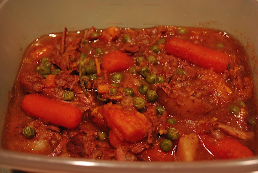 When the last of the meat was browned, I deglazed the pot with some Carmignano which had been opened a few days beyond deliciousness. As I scrapped the tasty bits from the bottom of the pot, I added a can of beef broth to the wine and heated it through. The liquid was then added to the Crock Pot and I set the temperature on high and went on my way for the next 4 hours or so, stirring every so often to circulate the flavors and juices.