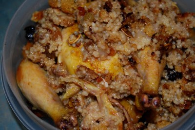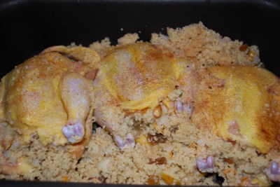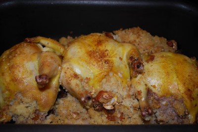By this point in our relationship, you know I’m not one for recipes for items like this. It’s all about the inspiration for me, and I had a hankering for couscous. We had a box (or 6. What was there a big sale?) of Near East in the pantry, so I made it according to the directions. Than I added golden raisins, some ripe chopped pear, roasted pumpkin seeds, diced onions and paprika. It seemed a little dry, so I poured in a bit of apple cider to moisten things up and, after rinsing the birds, lightly stuffed them with my couscous. I used the remaining couscous to surround the birds and finished by rubbing the breast area (hope your web filter didn’t just lose its sh*t) with olive oil, and then going a little crazy with sea salt and a dusting of paprika. To keep things moist, I added perhaps 3/4 of a cup of chicken stock to the pan and then I popped them in the oven at 375 for about 65 minutes and they were perfect.