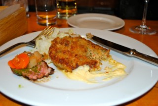 We arrived fairly early for lunch and had the spacious bar to ourselves.  Note to the tall: my freakishly tall friend (FTF) couldn’t express his satisfaction enough with the generous amount of allotted leg room at the bar.  The menu was succinct – a mix of creative takes on classic breakfast items, as well as some more substantial plates.  I went with the smoked salmon cake with fennel salad and remoulade.  The portion was satisfying in a way that made you both wish for one more bite, yet chew leisurely so as not to finish too soon.  FTF had a lamb dish which was delicious – beautifully medium rare and tender, paired nicely with roasted vegetables.