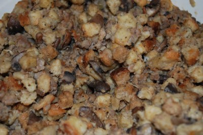 In a small amount of olive oil in a deep pot, cook onions until soft. Add sausage, apples and mushrooms in small batches. Rotate which ingredients you add to provide a layer of depth of ingredients – a chef I once worked with claimed it was a very Paul Prudhomme way to cook, using only a handful of ingredients but developing different degrees of texture as the items are cooked for varying lengths of time. Whatever – I cook it as fast as I can cut/chop it so it seems a natural way to do it. Cook over medium heat until the sausage is cooked through. There should a pool of liquid in the bottom of your pot as the apples and mushrooms release their juices, this is good – those dry bread cubes are really thirsty. In a large bowl combine half of the of contents of your pot with about 2/3 of your bread cubes. Repeat with remaining ingredients, stirring well. Taste for seasonings and adjust to your own liking. If the stuffing seems dry, add some liquid (broth or apple juice or a combination of both). Eggs can also be added at this time, but I would definitely skip the raw eggs if you’re cooking the stuffing inside of the bird, which is my preference. Place stuffing in an oven-to-table casserole or serving bowl and bake at 350 for about 30 minutes, covered if you like it extra moist, uncovered if you’re going for some of those crunchy bits on top. Alternately, live on the edge a little and loosely stuff the turkey, then roast for the recommended amount of time. Makes great sandwiches, too!