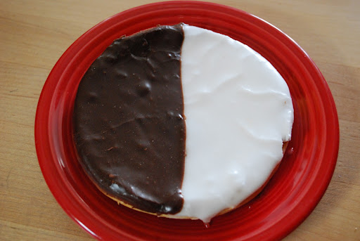 If there is any single food item which I consider myself to be an expert about, it is the black & white cookie. And – please don’t call it a “half-moon” because that makes no sense at all. I’ve eaten uncountable examples of this NYC delicacy and have concluded that my favorite examples are heavy for their size, frosted with an icing that hardens rather than remain ing squishy to the touch and with a faint lemony flavor to the cookie. Pictured above is my ideal – from Rocco’s on Bleecker Street, home also to the best pannetone I’ve ever had. This cookie gets elevated to the top of the heap by the addition of a light layer of apricot glaze between the spongy cookie and the icing. Unexpected to the uninitiated, delightful to the experienced. Get yourself to Rocco’s. You won’t be sorry.
