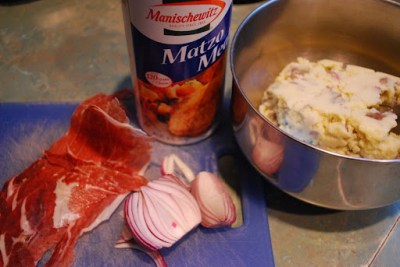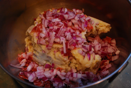 I chopped the onion and prosciutto and mixed them by hand (literally) with the leftover mashed potatoes.  Note: the reddish bits on the potatoes are the skins.  I almost never peel potatoes.  After mixing the onions, prosciutto and potatoes, I shaped the mixture into “cakes” that were basically the size of a generous crab cake.  I dipped them into a lightly beaten egg and then dredged them in matzo meal.  Bread crumbs or panko would work just as well, but matzo meal is what I had on hand and this exercise in cooking revolved around using what I had.