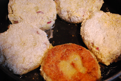 Next up – frying!  I heated some vegetable oil until it was hot enough to cause the potato cakes to make that lovely sizzle noise as I placed them in the pan.  I browned them on both sides and then moved them to a moderate oven (350) for about 20  minutes.  The time in the oven is completely discretionary – they were ready sooner than 20 minutes and they could have stayed in the oven longer.  It was just what worked for me.
