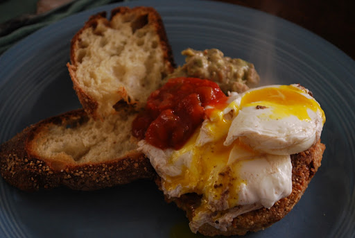 The potatoes became the base for a couple of softly poached eggs. I finished the plate with salsa, avocado mashed with a bit of sour cream and cumin and toasted no-knead bread. Yeah, I baked that beautiful bread – by the way, that’s another of my super powers. Coquette Woman saves the day with a tasty meal and once again thwarts the compost bin by using an array of leftovers creatively! Pow!