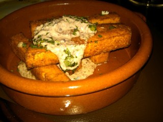 We were escorted to a table in a dining room occupied by 3 or 4 tables. After the water sale service, which is somehow less irritating in a town renowned for its water, we took a look at the menu and made our choices: an order of chickpea polenta fries, a house salad, the clam pizza and the house meat ragu. They serve their wine (like Otto) in quartos and we started with an Albarino with our first course, moving to a grenache/syrah (I think) with our second course. The food came out in a reasonable time frame and was the appropriate temperature with the courses being well paced. The server was occasionally attentive, but more often than not absent – not a real issue until we were ready to go and she was nowhere to be found. I understand that when things are less than busy it is easy for servers to get sidetracked with their own conversations and perhaps, sidework, but a walk through the dining room on a regular basis is never a bad idea. Just saying.