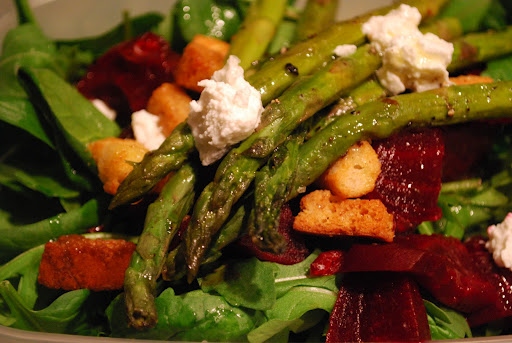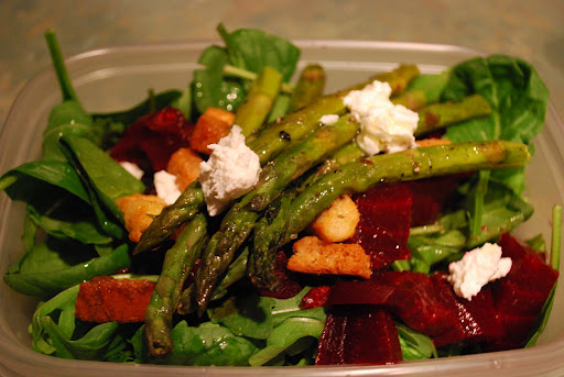 When it comes to winter eating, I love hearty stews, soups, baked goods and roasted vegetables and meats. As soon as the temperature begins to drop, I look for ways to turn my oven on to supplement the 66 degrees I keep the thermostat set on. Salad may not be your first thought for a winter’s lunch or a light dinner, but, add a couple of roasted vegetables to a bed of greens, and you just might find yourself not missing the warmer seasons quite as much.For today’s lunch I roasted a bunch of beets (cut greens and root off of beets, wrap them individually in foil, place on a baking sheet and roast at 400 degrees until they feel a bit soft, ~ 35 minutes. Cool and then unwrap and slide skins off.) and some asparagus (snap bottoms off, drizzle with olive oil and season with pepper and sea salt, roast for about 8 minutes at 400 degrees). Prepare a bed of greens – I used baby spinach and arugula, and dress lightly with olive oil and fresh lemon juice. I make my lunch typically at night and find that the combination of olive oil and lemon juice really holds up overnight without wilting the lettuce. Plus – who needs all that crap that is in commercially prepared salad dressings? Add your roasted beets and asparagus, a small handful of dried cranberries, some croutons for crunch and a bit of soft cheese. I went with goat cheese for today’s lunch, but have happily used varieties of bleu in the past, as well as Rondolet. It all depends upon what’s in the cheese drawer. Dig in with your fork and savor the flavors which transcend the calendar. Enjoy.
