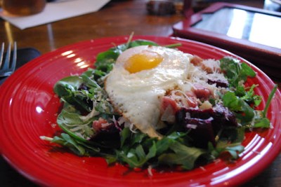 Saute a chopped onion in about 2 t of butter, over medium low heat. I went with a chop instead of the more attractive rings because I wanted the carmelization to happen sooner rather than later – greater area, quicker cook, right? After a quick stir to make sure the onions were all coated in butter, I turned the heat to low and allowed them to get beautifully soft. At that point, I added a thick slice or 2 of leftover spiral ham that I had cubed. As the onions and ham became acquainted, I laid out a couple of piles of greens and dressed them with olive oil and fresh lemon juice. I tossed some roasted beets on the plate and then shaved Parmesan generously all over – like snowmageddon generous. The gorgeous onions and ham were distributed around the plate and then I cooked 2 eggs perfectly over easy in the onion/ham pan. Ah – the crowning glory of the fried egg! Lavishly salt and pepper – then dip your fork into the yolk and let the mouth party begin. De-frikkin’-licious! It was a meal that was like the best of books – sad to conclude, but remaining alive in your memory for long after the inevitable end.