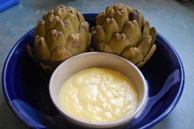 Steam artichokes in a couple of inches of water with some fresh lemon squeezed in.  This Hollandaise was made from 4 egg yolks, about 2/3 a stick of butter, a generous squeeze of lemon and a touch of water, salt and pepper.