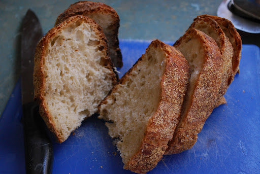 I used the basic No-Knead Bread recipe and then added between and 1/8 and a 1/4 cup of rosemary from my nearly dead rosemary plant.  During the second rise, when the bread is wrapped in a cotton cloth for 2 hours, I used coarse corn meal, a bit of sea salt and an additional 1/8 cup of rosemary.  Delicious!