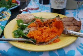 The only way to end a day like this was with an impromptu dinner party. I already had a mess of pork chops marinating in soy sauce and kecap menis, so I decided to call the neighbors, add some chicken breasts to the grill and make it a party. Ken and Lori shared their crop of freshly picked spinach so I made a salad of the greens with Gorgonzola, strawberries and a light lemon and olive oil dressing, along with some grilled asparagus and baked sweet potatoes. The table was lovely, the evening was mild enough for comfort and the wine, a 1997 Petite Syrah from Lava Cap, was fantastic. Since I hadn’t a chance to bake (I know, I’m such a lax hostess! What the hell was I doing all day instead of sifting and stirring?!), we finished our meal with leftover Easter candy, including a fresh box of Peeps, and sips of Navan. Delightful.