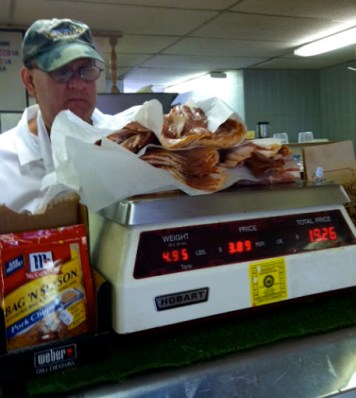 All told, I walked with a hefty bag of bacon, numerous pounds of various sausage and about 3.5 lbs of sirloin steak for grilling for less than $60. The beef had a lovely color, full flavor and a thick edge of fat that grilled up beautifully. I found the Italian sausage to be a little dry after grilling, but that may have been more a function of the gwui (grilling while under the influence) than the fault of the sausage. I tossed some in the freezer and I’ll try to remember to cook those with a little more care and perhaps a little less wine. And the bacon? As always, it broiled up nicely in the oven and there wasn’t a speck left.