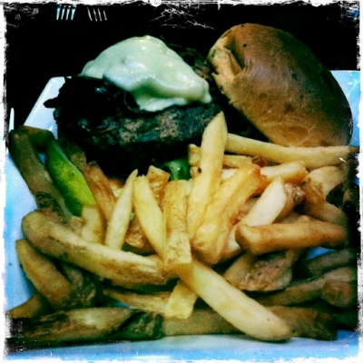 I ordered the Van Dyck signature burger asking for it to be cooked no more than medium rare. As you can see, the plate was prettily presented with fries and a pickle and big burger. I immediately went for the fries which were…not hot. I’m sorry, but I don’t eat fries all that often and when I have potatoes which have been completely submerged in nearly boiling oil on my plate, I want them HOT. So, I flagged over the server and asked for some hot fries, a request which seemed to puzzle her a little, but one which she was more than willing to accommodate. It was only after she left the table that I cut into my too-big-to-manage-without-cutting-in-half burger and realized that it was cooked way more than medium rare. In fact, it was well done. I just didn’t have the heart to send it back and since it did still manage to be flavorful, I ate it. The balsamic onions added some moistness to the meat and it was a pretty good burger – actually it was as good as a well done burger could be, I bet. The pancetta was a nice salty addition and went well with the char on the burger. I couldn’t eat the entire burger/roll, so I did my best with the beef and sadly left most of the lightly toasted roll on the plate, opting instead to indulge in the hot fries.