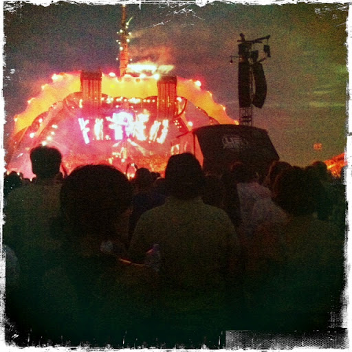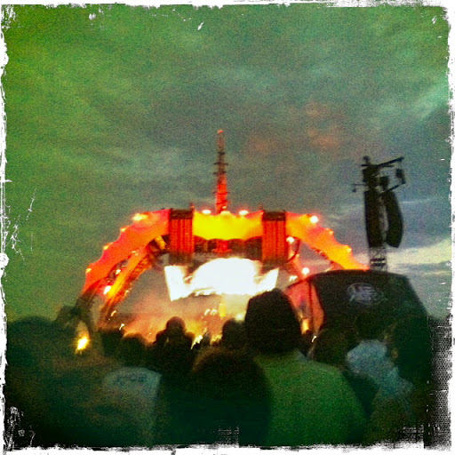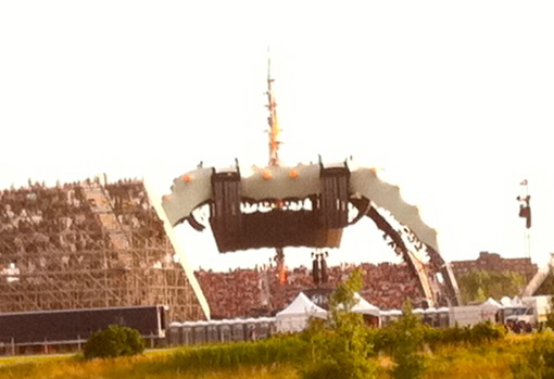 But, back to this trip…the drive was uneventful and we skirted around the main border crossing thanks to a tip from my friend, Kevin. After checking in to our hotel, we grabbed a quick bite to eat and then headed for the show convinced that getting there was going to require patient efforts. And, we were right. Seriously, Montreal Metro folks, how about opening up more than a single window for ticket sales? I mean, oui, I understand there is that single automated ticket machine, but when you’re expecting 80,000 to travel to a venue where there is no parking, what were you thinking? Eventually, we got there, happy to be freed from the packed to the gills train on a very hot evening. There was a short walk to the actual venue and we settled into a comfortable spot on the “floor” of the arena. prepared for our universe to be rocked. Things here were fairly well organized – lots of porta potties, vending and plenty of concession people circulating with cold, expensive beverages. But, who cares about any of that? It was about the show dammit!