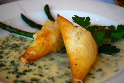 The third appetizer that landed with supreme grace on our table was the phyllo-wrapped scallop. I seriously don’t know how it is done – cooking the scallop to perfection while it is nestled in an amazing blanket of creamed leeks and wrapped in gorgeously golden phyllo… I made a vow to never work with phyllo pastry again after an awful experience with it years ago and I have great respect for those who can manage this persnickety dough. This dish was absolutely lovely.