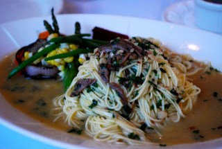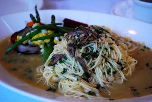 The pasta was supremely simple and delicious – Angel Hair with garlic and anchovies . Did I mention I was dining with a friend, not a date? Yeah, garlic!! Yeah, anchovies!! Bring it on…