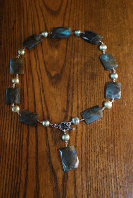These three pieces provide a pretty good example of the variety of work Elissa does, I think. The first piece always makes me feel like a Celtic warrior princess when I wear it – it is a strong statement necklace that speaks in an unrefined, natural voice and it really goes with most anything. The middle necklace was a complete surprise purchased for me by friends in Boston and selected personally by Elissa for me. That is one of the super cool things about Elissa – she knows her clientele and has helped me to choose items for friends when I have been overwhelmed by the options. I love that middle piece because it is beautifully delicate, yet assertive at the same time – perhaps the “me” I strive to be. The bottom piece is a favorite for sure. The photo doesn’t do the greens justice, however, trust me, it is stunning. There is so much texture and there are so many shapes involved in this necklace, but they are balanced by Elissa’s tremendous eye for design.