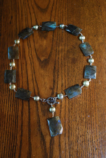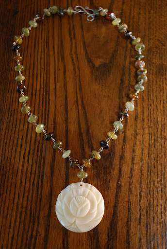 These three pieces provide a pretty good example of the variety of work Elissa does, I think. The first piece always makes me feel like a Celtic warrior princess when I wear it – it is a strong statement necklace that speaks in an unrefined, natural voice and it really goes with most anything. The middle necklace was a complete surprise purchased for me by friends in Boston and selected personally by Elissa for me. That is one of the super cool things about Elissa – she knows her clientele and has helped me to choose items for friends when I have been overwhelmed by the options. I love that middle piece because it is beautifully delicate, yet assertive at the same time – perhaps the “me” I strive to be. The bottom piece is a favorite for sure. The photo doesn’t do the greens justice, however, trust me, it is stunning. There is so much texture and there are so many shapes involved in this necklace, but they are balanced by Elissa’s tremendous eye for design.