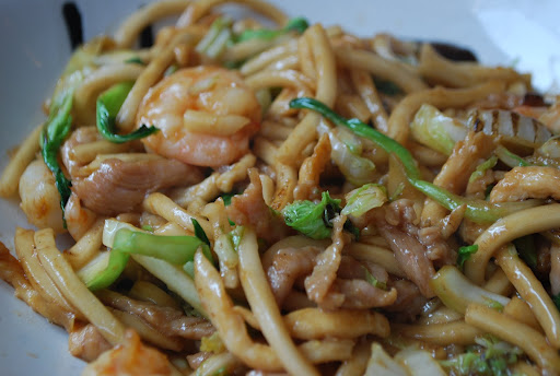We scored a great table by the window and quickly made our decisions – scallion pancakes, soup dumplings, shrimp, pork and chicken lo mien, and sauteed green beans.  Our server warned us that the dumplings would take 20 minutes, a reality which dragged our light meal out into a 3 course affair, but no worries.  The scallion pancakes were fine – hot, kind of crispy, but not really special like the ones I enjoyed at Vanessa’s.  Things picked up with the lo mien – it was flavorful, hot and with the perfect amount of oil to keep things delicious without leaning towards greasy.  I neglected to photograph the green beans which is unfortunate because they were a little different than what I have experienced in the past.  Rather than a simple garlic and oil coating, they had almost a hot and sweet flavor.  I do believe they even initiated my hiccup response to hot peppers, albeit briefly.  The sauce was a bit reddish and clung to the beans beautifully and while they were different than what I am accustomed to, they were enjoyed by all three of us.