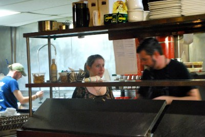 Although Kevin took possession of the space less than a month ago there have been some positive improvements, with more still to come, of the interior.  Were you here when it was Pasquale’s?  I always loved their pizza, but found it to be a bit pricey when feeding 3 hungry boys who can each pack away 3-4 slices each, especially when the pizza has a divine thin crust.  Anyway, the configuration is similar to what it was in the past with an open kitchen and seating for 40+.  Eventually there will be an actual bar with seating, which is a good thing – they’re going to need all the chairs they can find.  Last night at about 7:30 when we arrived, there were not many tables available, and that was without any real advertising.  This place is going to be busy!