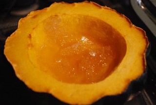 I’m sure there are a million ways to cook these hard shelled squashes but I usually do the a variation on the same theme: squash + something sweet + fat + spice. My something sweet is generally either brown sugar or maple syrup, but this batch ended up with something a little different. See that picture of the amber-colored rock candy-ish stuff? Well that’s what you may find, if you’re lucky, at the bottom of your maple syrup container. I knew there would be a use for it one day and this was its day to shine! If you aren’t fortunate enough to have maple “glass,” I’m positive that maple syrup would work just as well, it just wouldn’t add moisture and flavor simultaneously. Cut the squash through the middle and scoop out seeds and gook. (Compost!) Trim the top/bottom of your halves in necessary to allow them to “sit” without wobbling. Add some maple syrup or brown sugar, maybe 1.5 T per side, a dab of butter and some nutmeg, clove or cinnamon – or all of the above. Bake at 375 degrees until the squash is soft but not caving in on itself. Maybe 35-45 minutes depending on size – size can be a real factor sometimes. If you’re in a rush, place squash, cut side down in a shallow glass plan with about an inch of water and place in the microwave on high for about 10 minutes. Finish in the oven for another 10 to 15 minutes. Cut into wedges and serve, or eat the whole thing yourself.