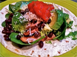 I had two baked chicken thighs (bone in) hanging out in the fridge. I took the meat off the bone and basically ripped it into shreds and tossed it into a can of semi-drained black beans. I added some cumin, salt and two chopped chipotle chiles along with about a teaspoon of the adobo sauce the chipotles were packed in. As this heated through, I warmed two tortillas and gathered some vegetables in the form of a half avocado, sliced, and some baby spinach. I built a gorgeous mound of the green veggies, the beans and chicken and then finished with a dollop of salsa and a bit of shredded cheese. My plan was to eat two of these bad boys, but when I paused after wolfing one down, I realized I was quite full already. I was a little bummed that my capacity was so limited, but since I’m not a fan of that over-stuffed feeling, I was pleased that I knew when to stop and that there would be another yummy burrito meal to look forward to.