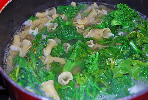 About 2 minutes before the pasta was ready, I added the broccoli rabe to the pasta pot to soften it a bit. Then it was just a simple matter of draining the pasta/broccoli and tossing it around the pot with the yummy olive oil concoction. I finished things up with a little salt, the walnuts and some fantastic grated aged Parmesan.