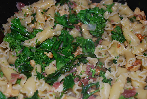To begin, I sautéed a few chopped cloves of garlic and about half of a large, sweet onion in olive oil. I really took my time with this to allow the sweetness of the vegetables to come out and to give the water time to get to a rolling boil. To keep myself busy, I cut my prosciutto into small bites and rinsed my broccoli rabe. Once the water was ready to be introduced to the pasta (I went with Campanelle or “church bells” on a friend’s recommendation. Good call, my Italian friend.), I added the prosciutto to the sauté pan along with some crushed red pepper flakes. I had some walnuts on hand so I gave them a light toasting (with me, it’s either a light toasting or blackened) and coarse chopping.
