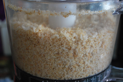 Directions?  Rip bread into large pieces.  Place in food processor.  Pulse.  Done.  Satisfying to my cheapskate self and hopefully to the taste buds as well.  What are your thrifty kitchen tips?  Got some to share?