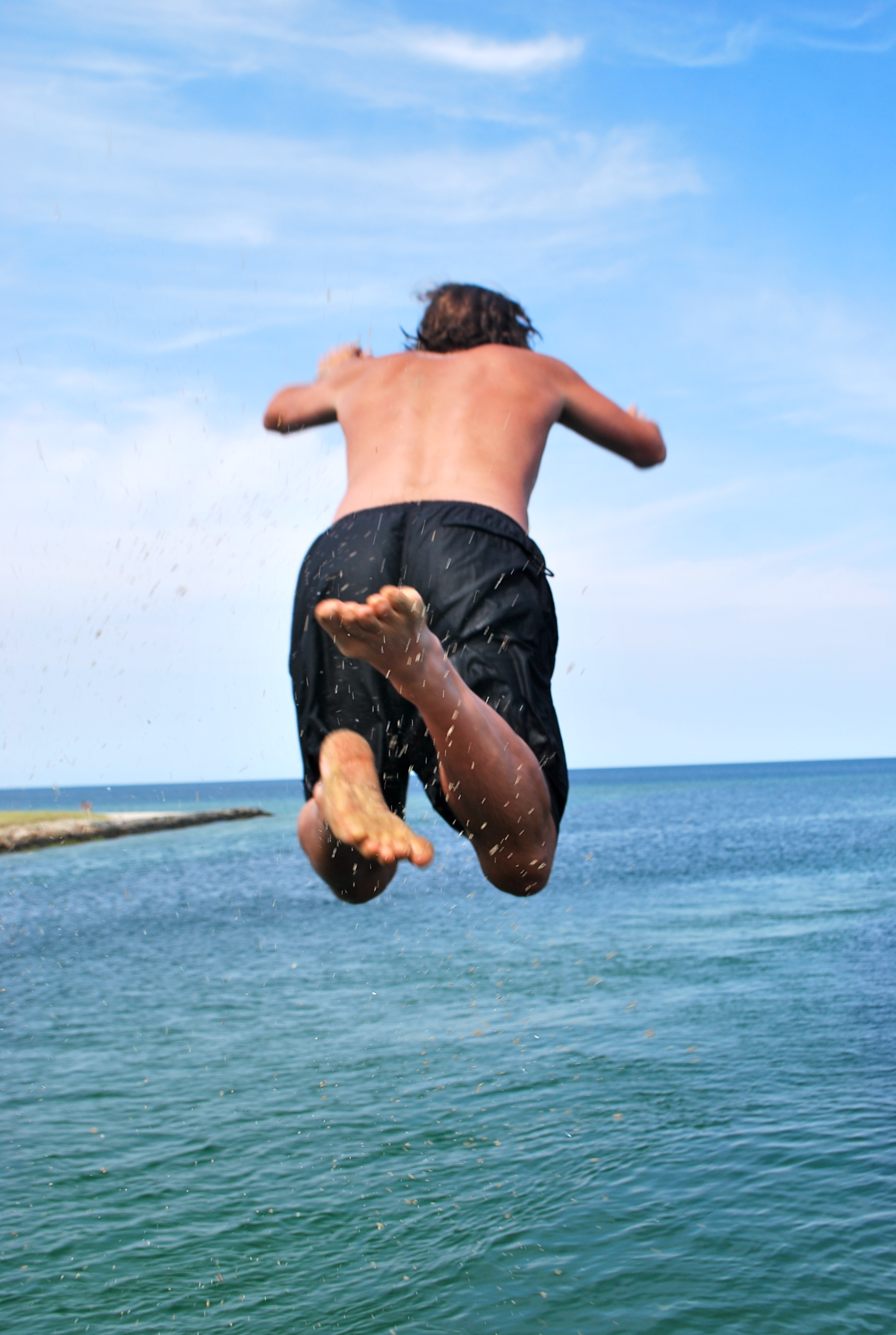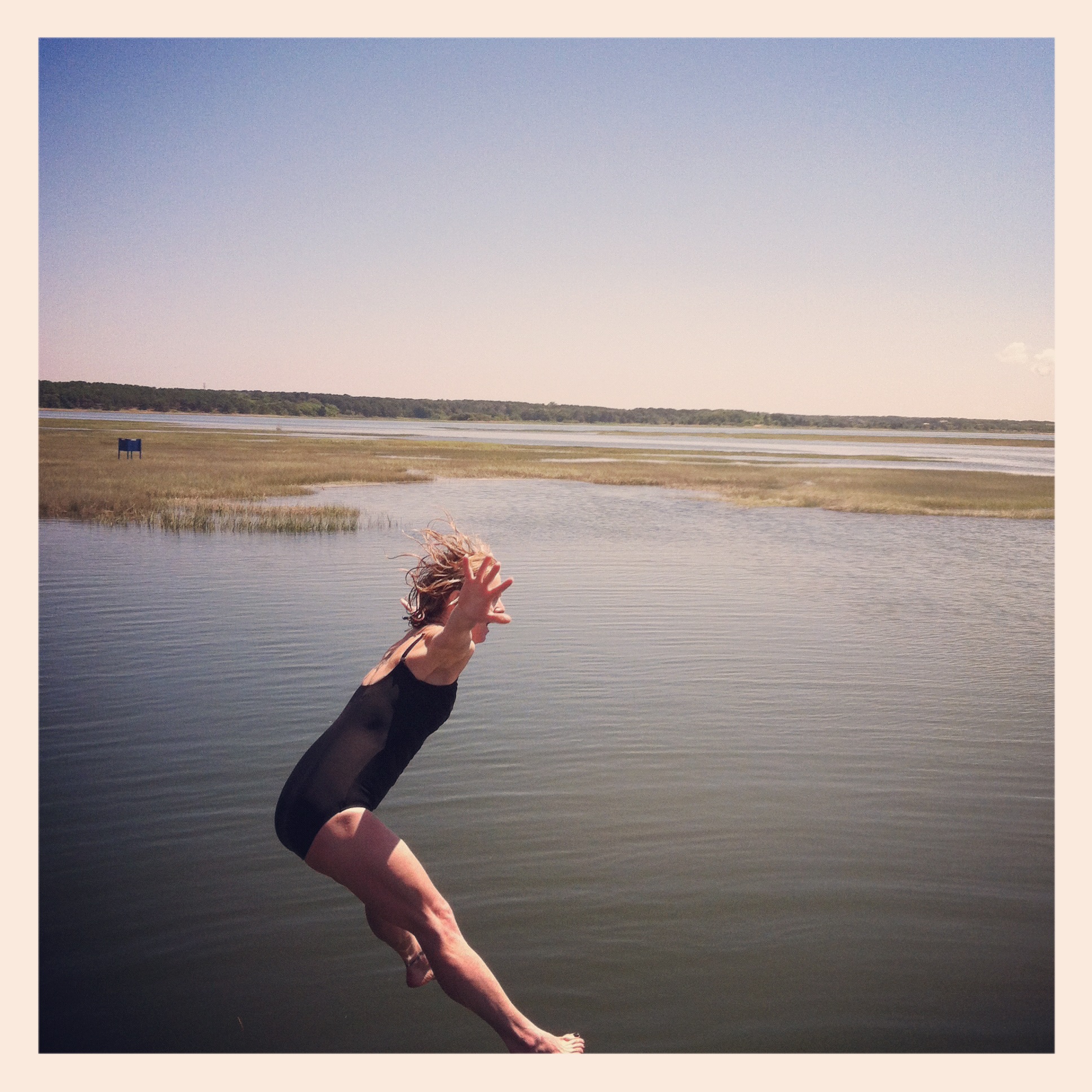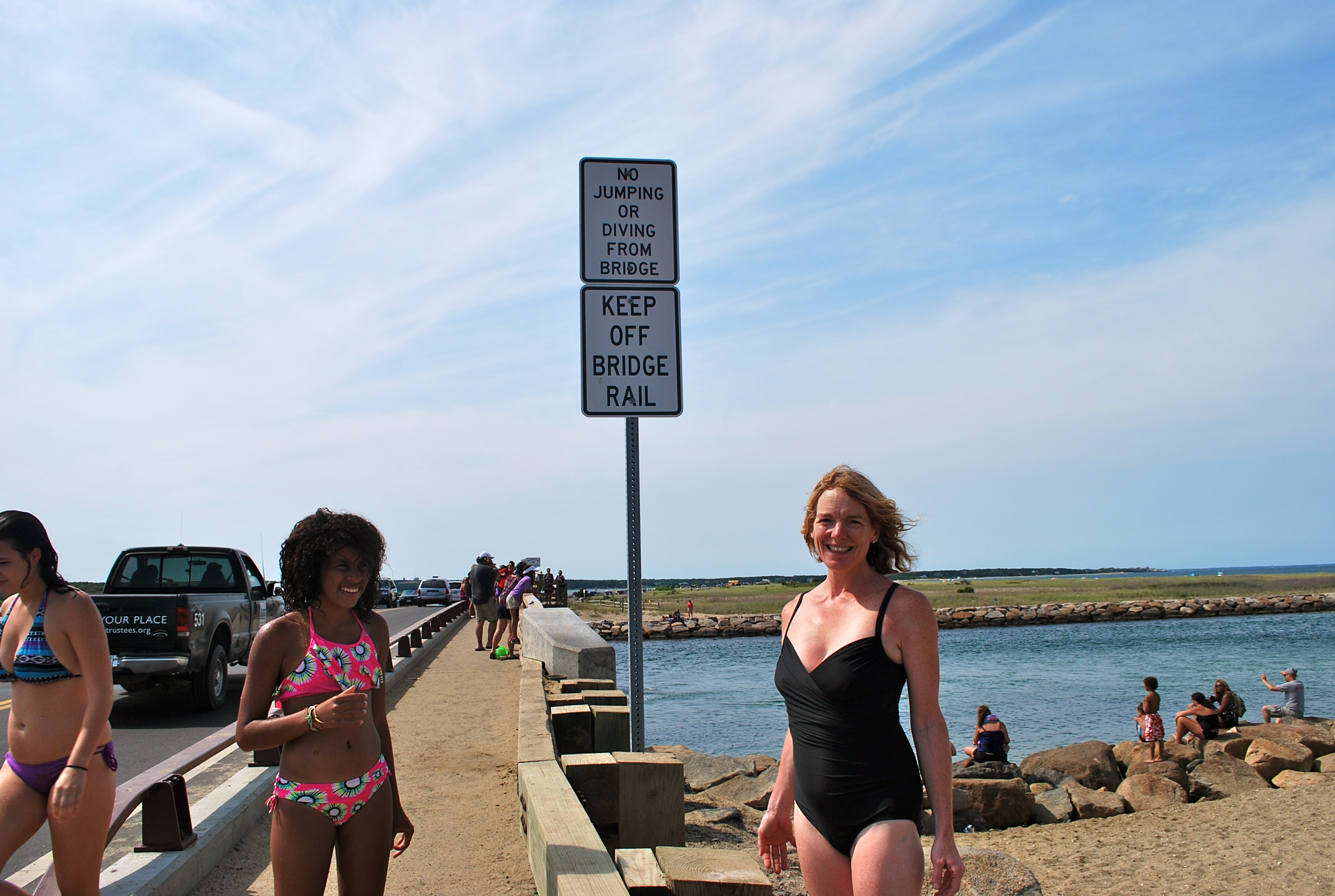 During our annual beach vacation, we encountered a couple of opportunities to take a flying leap.  A sort of “long walk off a short pier,” to use the local vernacular.  Our first chance was on the road leading to Lieutenant’s Island.  Have you been to this part of Wellfleet?  It’s a lovely, fantastically isolated bay beach that is great for the younger set.  No waves, limited parking, and a bridge which is perfect during high tide for jumping.  The day we were there to jump, tide was really high making the bridge impassable due to the water level – it was about knee-high.  This was Quinn’s first year to take the plunge and he was fabulous!  The only real drawback to this activity, or to Lieutenant’s Island in general, are the voracious green-head flies.  My God, they are vicious!  We each took a few jumps and then ran through the remarkably warm water back to the wagon.