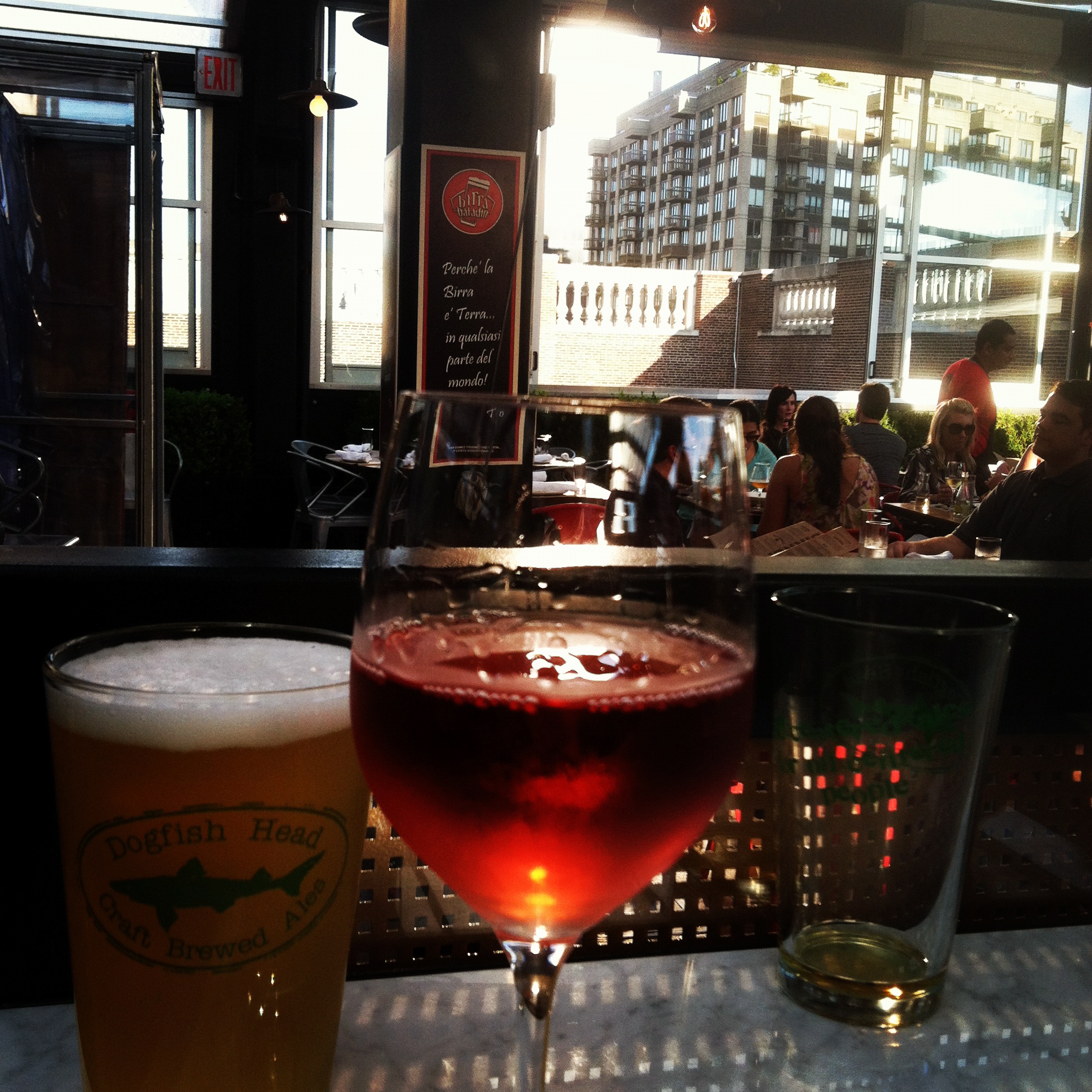 I was traveling with my bestie and we had nothing but time so we began at Eataly’s amazing rooftop beer garden, Birreria. Although I’ve been to Eataly a number of times, this was my first occasion to visit this hip hangout and I will definitely head back there again. The elevator to reach Birreria is a bit hidden, but well worth finding. I was committed to drinking grape rather than grain, so it was a pricy and pretty rose’ for me – Fontana Fredda Langhe Rosso 2008 $18, 250 ml. Refreshing and tasty.