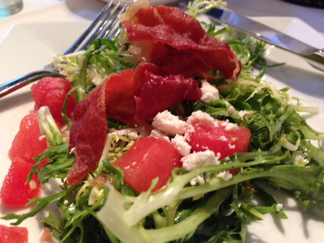My salad course was composed of watermelon, arugula, ricotta salata and crispy prosciutto.  I’ve been loving watermelon this summer and you know how I feel about arugula.  Yes, this made me happy.  Especially when the person who knows my wine palate better than anyone recommended a glass of Chardonnay for me which was lovely.