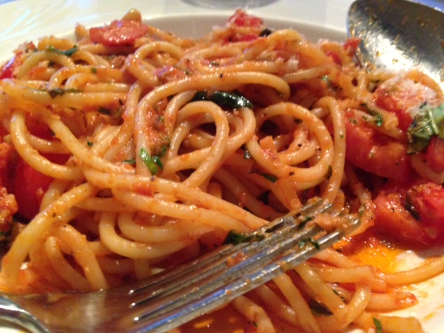 Seeing that I was carb loading for the next day’s Warrior Dash, I enthusiastically indulged in a tremendously satisfying and seasonal pasta of bucatini with fresh diced tomatoes, basil, garlic oil and Reggiano Parmigiano.  Note: when I say “fresh diced tomatoes,” I mean FRESH.  Connie, who owns Mezze Notte with her husband, Mitch, stopped in on a rare evening off to deliver some gorgeous vegetables from her garden, including a number of bright red tomatoes.  Summer’s best!