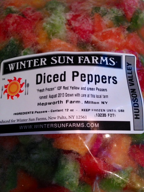 I started with a chopped onion and a bag of frozen chopped peppers from my Field Goods service. Talk about easy – cut open the bag and toss it into the pan! When the veggies were softened, I removed them from the pan and sautéed the chicken, which I had cut into 1.5-2″ chunks, in the same deep pan. When the chicken was almost cooked through, using a slotted spoon, I removed it and put it aside.