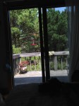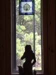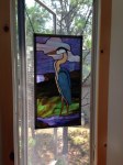 The stained glass window hanging in the floor to ceiling window in the living room.